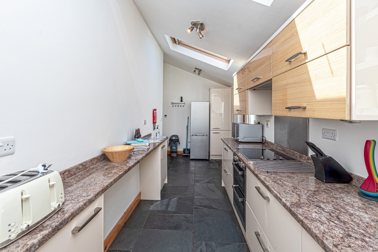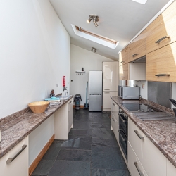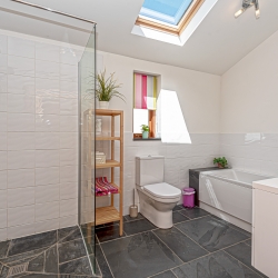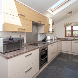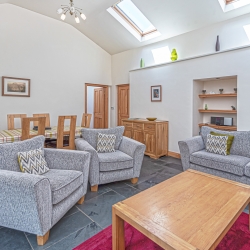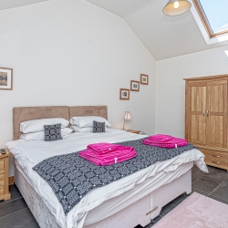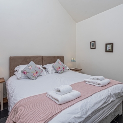 The airy and spacious living/dining room has comfortable sofas and chairs around a cozy log-fire, with widescreen TV with DVD and Freeview, and the dining area features a lovely oak table and chairs. There are two bedrooms, both of which have super king double beds which can be split to provide two full-sized single beds if required. The pretty main bedroom enjoys an en-suite bathroom with a walk-in shower. The family bathroom has a double-ended bath and a separate shower. Bed linen and towels are provided in the price of your rental. The bright modern kitchen has a double-oven & grill, ceramic hob, dishwasher, microwave, and fridge freezer, and is well-equipped for those who enjoy cooking.