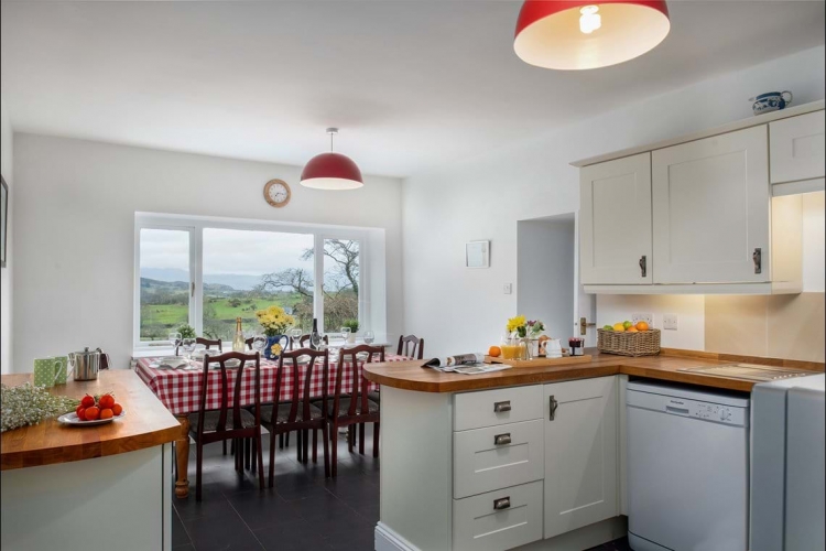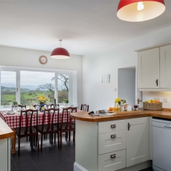 Ty Mawr is the original farmhouse for Eisteddfa farm and offers comfortable accommodation for families and groups of up to 8 people. In a beautiful rural location the house is easily accessible being approx half a mile from the main road up a private driveway. Entering into the slate floored hallway the bright kitchen diner is on your right, with oven, hob, microwave, dishwasher, fridge and freezer. Further fridge and freezer space is located in the utility room with washing machine and dryer.