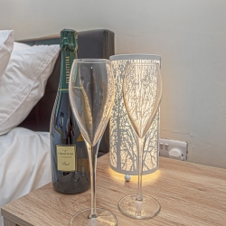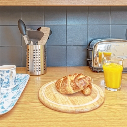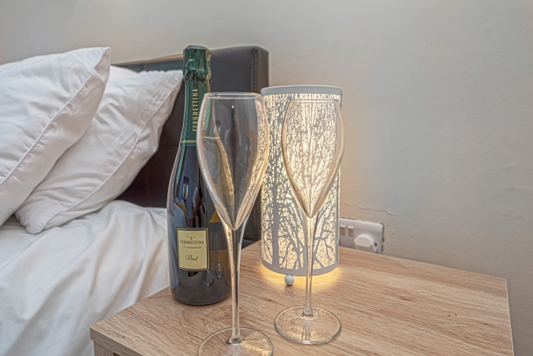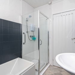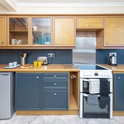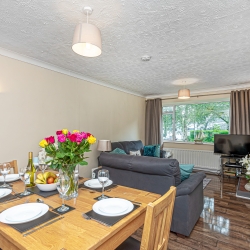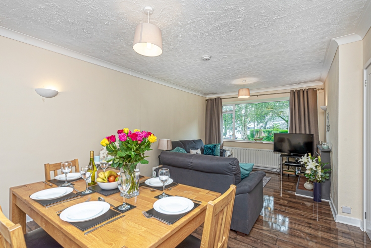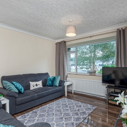 Large, spacious, and airy 21 foot lounge/dinning room with 3 seater & 2 seater comfortable sofas, free standing flat screen Samsung TV with freeview, 2 small side tables & lamp, and radiators. Dining table and chairs. Large 3 meter windows at both ends of the room allow natural light to flow through.