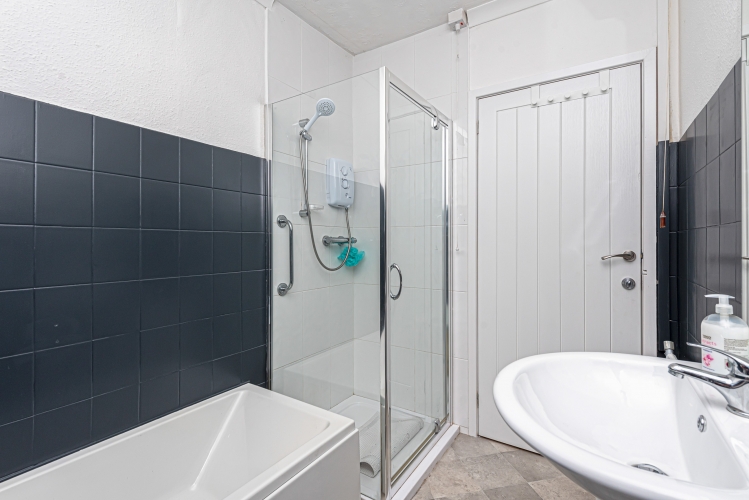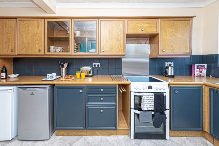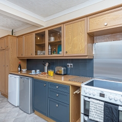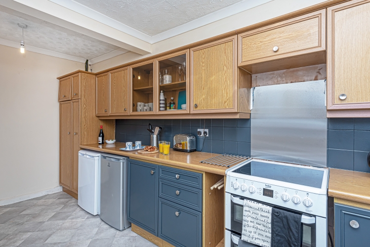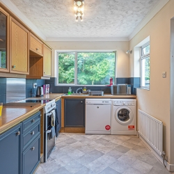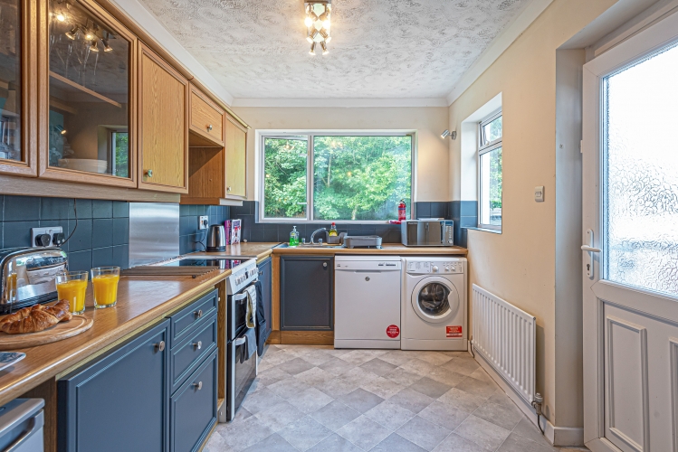 Separate fridge & freezer units, electric oven with grill, electric hob with extractor hood above, microwave, dishwasher, sink and drainer with mixer tap, washing machine. 2 windows to the rear, ceiling spot lights and a range of fitted cupboards with plenty of storage and worktop area. Lawned area to the rear, with steps down to the paved area and lawn.