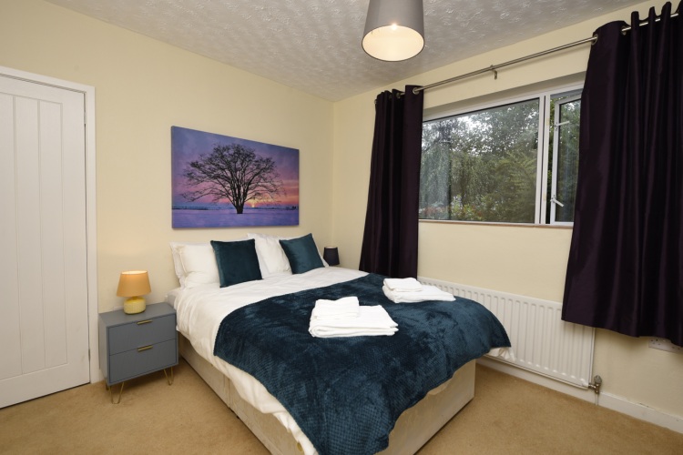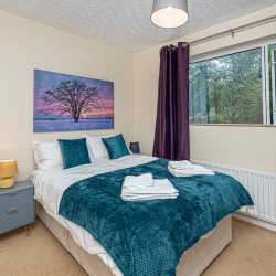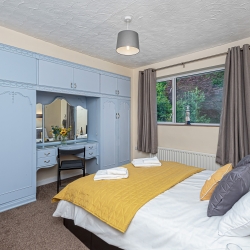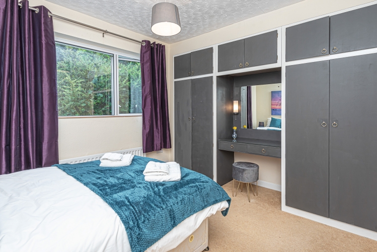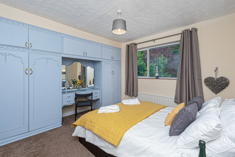 Double size bed, bedside tables, table lamps, and large built in wardrobes with drawers & cupboards above. Large window to the front, radiator.