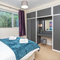 King size bed, bedside tables, table lamps, and large built in wardrobes with drawers & cupboards above. Large window to the rear, radiator.
