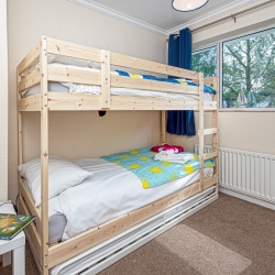 Bunk beds with trundle pull out underneath, bedside table, window to the front, radiator.